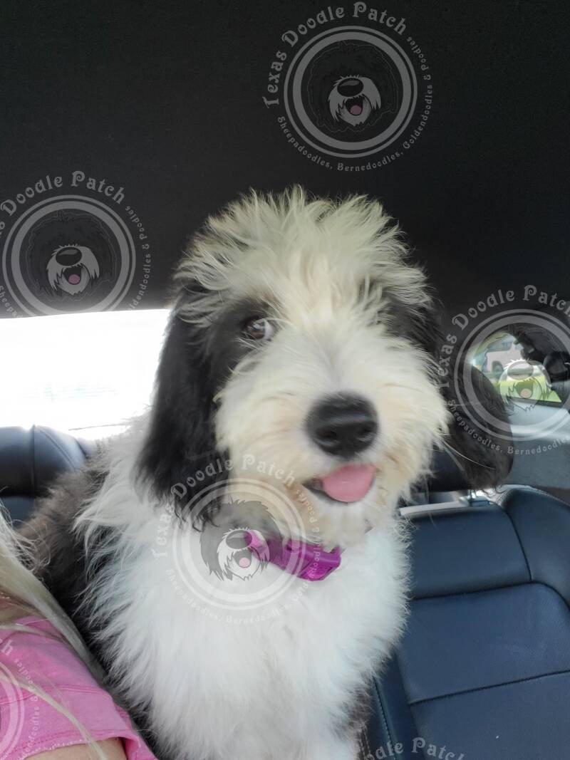 Maggie Mae is our F1 Sheepadoodle who lives with our daughter. She weighs about 50 pounds. We breed her with Kona for F1b Sheepadoodles and they have given us a wide variety of colors!